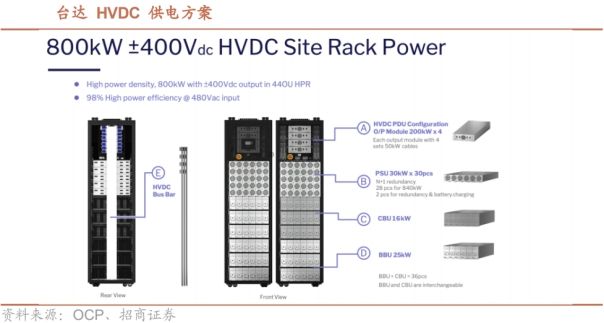 随着ICT设备功率密度持续攀升,传统UPS在效率、散热和占地方面的瓶颈日益凸显,HVDC因其高效、结构简单、更优供电半径等明显优势,将成为数据中心特别是超大型数据中心供电的主流路线。英伟达等公司联合电源、元器件供应商,加快研发800V HVDC供电方案,并发展出集成BBU、超级电容、PDU 和Power Shelf的新解决方案。在此变革中,中国企业也加速导入,未来有望获得优异回报。