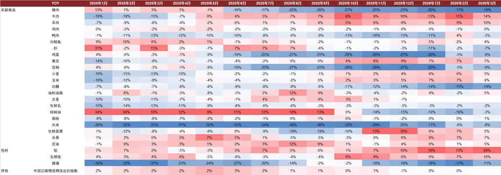 ► 其他占比更大成本项表现平稳或同比下滑。2026年以来,进口无水黄油、白糖、蛋液等成本下滑。此外,2026年一季度鱼糜、鸡肉价格保持平稳,猪肉价格仍同比下降。