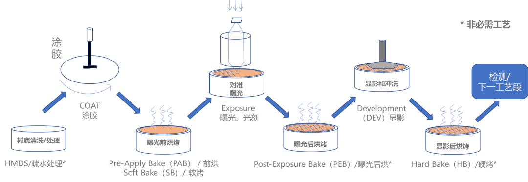 一般来说,这个过程通常包含这几个步骤:涂胶——软烤——曝光——显影。此外,在实际应用中,还会根据需要增加疏水处理(HMDS)、曝光后烘(PEB)、硬烤(HB)等步骤。