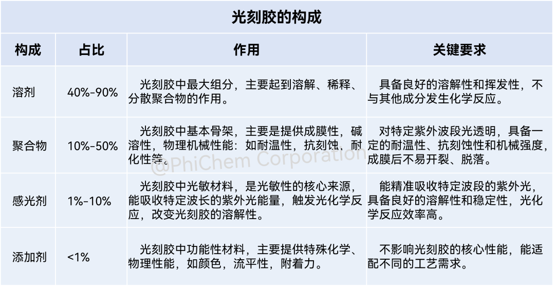 光刻胶并不是一种简单的胶水,而是一种精密的化学混合物,通常由四部分组成: