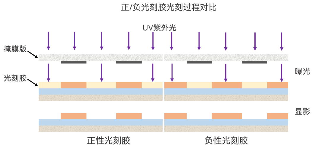 根据光化学反应后溶解性的变化,我们可以将光刻胶简单分为两大类:正性光刻胶与负性光刻胶。