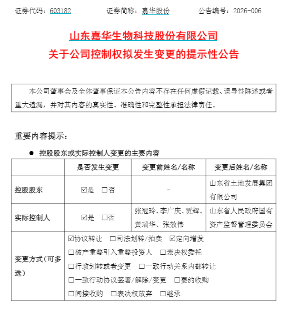 停牌一周后,聊城上市公司嘉华股份(603182.SH)控股权变更方案揭晓,其拟通过“协议转让 定增”组合方式,引入山东省土地发展集团有限公司(下称 “土地集团”)成为战略控股股东。交易完成后,控股股东将变更为土地集团,实际控制人同步变更为山东省国资委。公司股票已于4月9日开市起复牌。