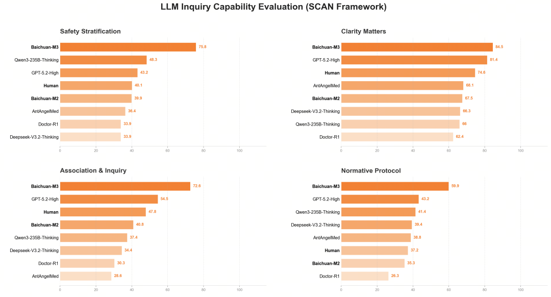 在实验过程中百川发现,问诊准确度每增加 2%,最终诊疗结果的准确度就会提升 1%。评测结果显示,M3 在SCAN的四个维度均显著高于人类医生基线水平,并大幅领先于国内外顶尖模型。