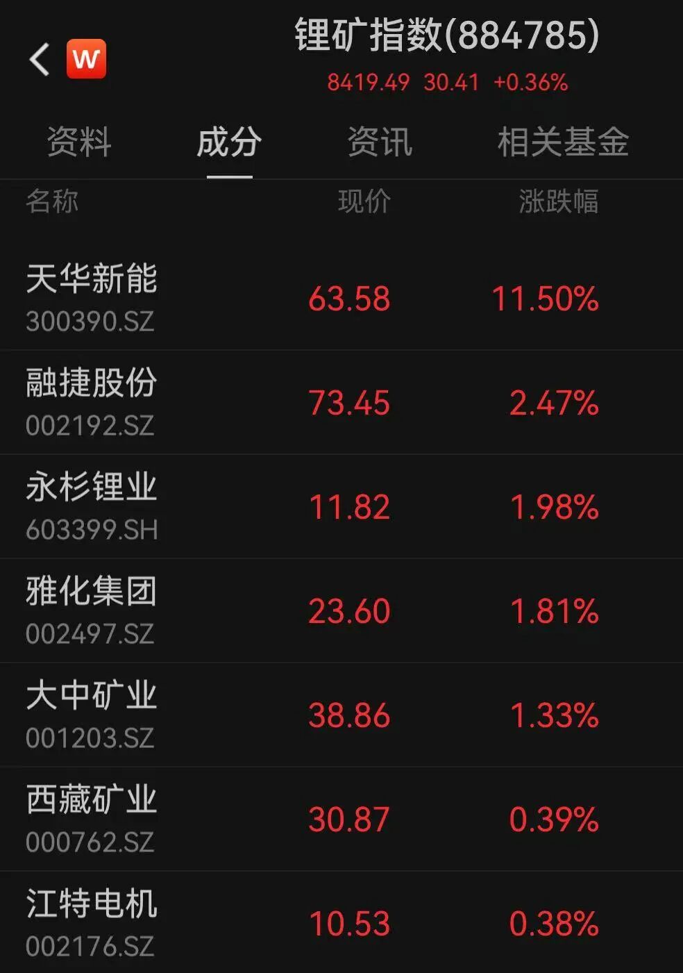 4月9日,A股市场震荡,锂矿指数盘中一度跌逾2%,之后持续拉升,盘中一度涨逾1%。截至午间收盘,锂矿指数上涨0.36%,成分股中,天华新能涨逾11%,融捷股份等跟涨。天华新能4月8日发布一季度业绩预告。公司预计2026年第一季度归属于上市公司股东的净利润为9亿元—10.5亿元,同比增长27517.53%—32120.45%。对于业绩大幅增长原因,天华新能表示,报告期内受储能与动力电池下游需求增长推动,公司锂电材料业务利润大幅增长。今年以来,天华新能股价持续走强,累计已涨逾16%。东方证券表示,短期来看,津巴布韦出口限制等供给扰动未解,矿端紧张预期维持,锂价支撑明确,二季度价格上行概率较大。中期维度下,新能源汽车出口超预期及新车型周期驱动需求持续改善,供需格局边际收紧,锂价中枢有望持续上行。中邮证券表示,地缘冲突持续引发市场能源短缺,澳洲采矿业对柴油高度依赖,铁矿石企业菲尼克斯资源有限公司公告将出现燃油中断,澳洲地区锂矿产业可能出现不同程度减产,或影响全球30%的锂矿供给。津巴布韦锂矿停运时间过长将影响5月以后锂矿供应。需求端海外新能源汽车销量有望好转,叠加储能订单持续景气,预计未来锂价将维持宽幅震荡,基本面支撑下跌幅有限,向上空间需看储能、新能源车订单成色。