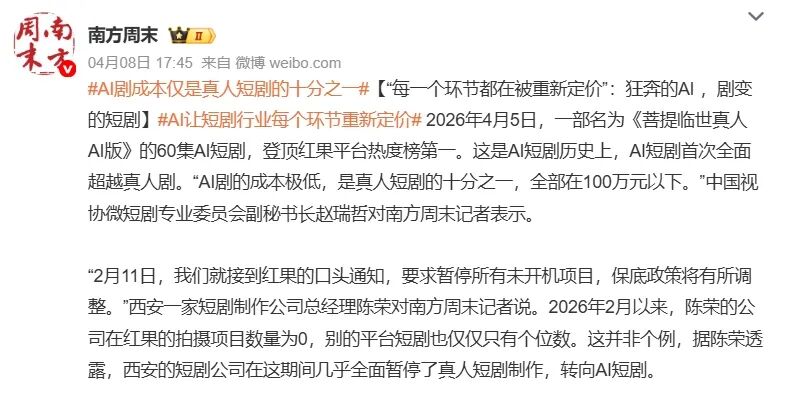 此次《菩提临世真人AI版》霸榜,标志着AI制作正在进一步侵蚀真人短剧的流量基本盘。相比之下,真人短剧的寒意则显得愈发刺骨,尤其是竖屏短剧,不仅开机量节节下滑、演员片酬锐减,最近还爆出了制作方欠薪事件。