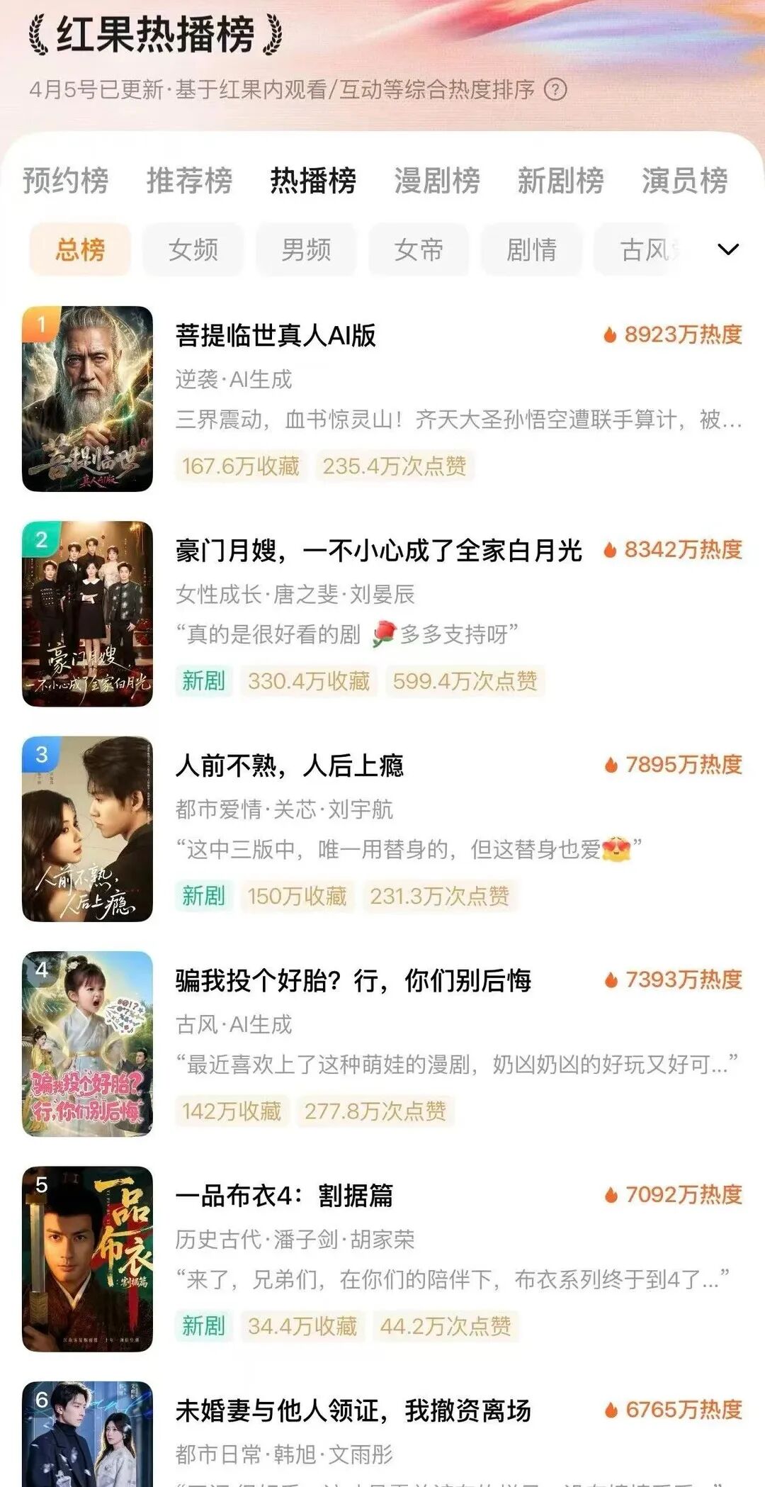 “趣解商业”注意到,进入4月以来,红果短剧总榜前5中,经常有一到两部属于AI仿真人剧,既有男频类型也有女频类型。