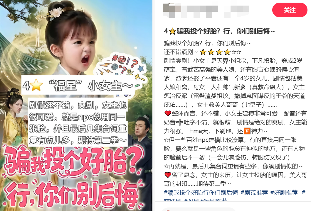 此外,AI生成也可以规避部分制作风险。今年广电总局对儿童类微短剧进行管理后,各平台都不再接收萌宝题材的本子,一些仿真人短剧开始用AI生成符合要求的萌宝形象,规避未成年人拍摄风险。刚结束的清明假期,一部讲述天界小祖宗下凡的《骗我投个好胎?行,你们别后悔》跻身红果热播榜前三,里面的主角萌宝“时叶”便是由AI制作。