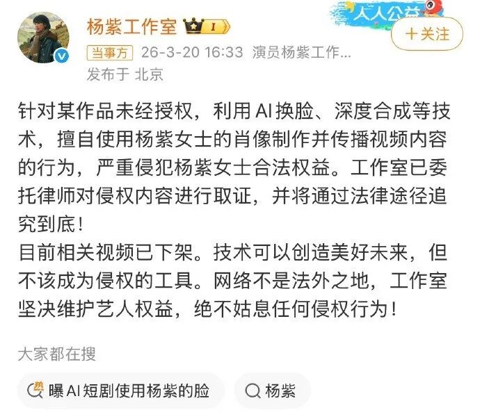 最近,龚俊、易烊千玺、杨紫等演员都公开发布维权声明,抵制AI 短剧擅自盗用肖像、声音合成虚拟形象用于牟利。除了高知名度的艺人,有自媒体博主也发文表示,短剧《桃花簪》未经授权使用了自己肖像特征生成剧中反派角色。