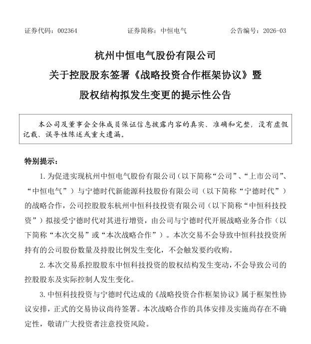 4月9日消息,昨日晚间,中恒电气发布公告,公司控股股东中恒科技投资及其股东朱国锭、包晓茹与宁德时代签署《战略投资合作框架协议》,宁德时代拟以约41亿元认购中恒科技投资新增注册资本,助力双方实现资源互补、协同发展。