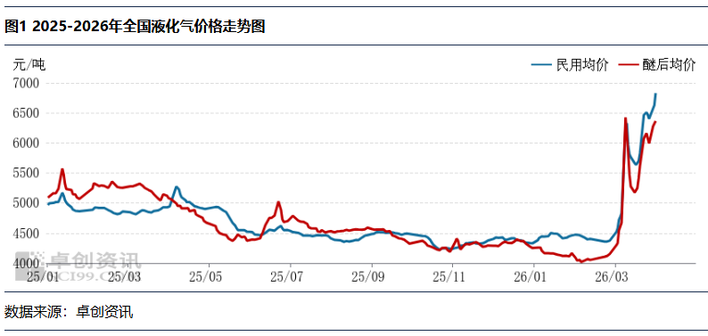 进入3月国内液化气市场宽幅震荡,呈现“涨-跌-涨”态势,民用气与醚后C4价格同步运行,价格重心较上月显著上移,地缘局势为全月核心驱动因素。截至3月27日收盘,国内民用气月均价5718元/吨,环比上涨1306元/吨,涨幅29.60%;醚后C4月均价5444元/吨,环比上涨1369元/吨,涨幅33.59%。上旬,中东冲突升级推升国际油价,LPG进口成本高企,叠加国内炼厂降负、到船减少,资源供应趋紧,民用及醚后C4价格同步大幅上行。但在LPG价格阶段性触顶后,下游企业高价接货意愿降低,叠加中东局势缓和、原油回落,价格震荡回落,部分地区已回吐前期涨幅。进入3月下旬中东局势再度升级,供应中断与成本抬升担忧升温,价格再度走高。整体来看,本月市场走势与地缘局势高度绑定,国际油价波动直接主导价格涨跌。其中民用气受供应端支撑更显著,醚后C4受油品市场及深加工需求影响更大,二者走势同步但弹性存在差异。
