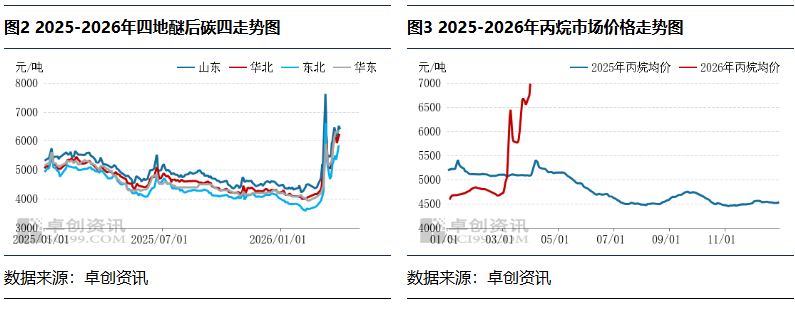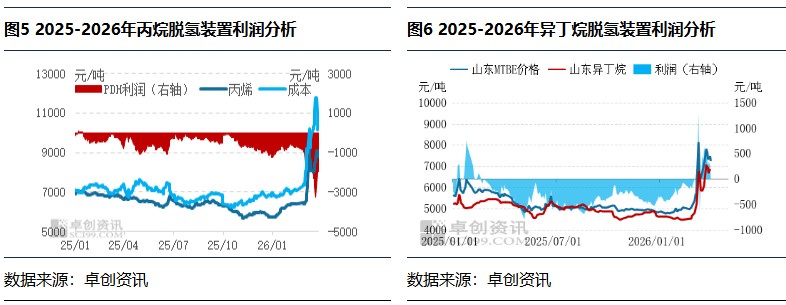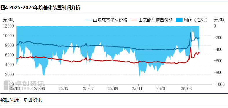 LPG下游深加工方面,以烯烃资源为代表的烷基化装置亏损情况在3月显著改善,核心驱动为地缘风险推升产品价格,原料涨幅弱于成品,价差修复带动亏损收窄。截至3月27日,山东醚后C4主流价5950-6220元/吨,烷基化油价格9150-9540元/吨,当日装置利润为-214元/吨。据卓创资讯监测,以当日成本与产品价格测算,3月山东烷基化装置月均利润-284元/吨,较上期月报亏损收窄128元/吨。中东局势升级带动烷基化油价格大幅上行,而原料醚后C4涨幅相对滞后,原料与成品价差持续修复,是装置亏损明显减少的核心原因,行业盈利压力较前期显著缓解。