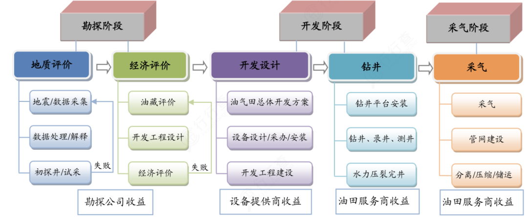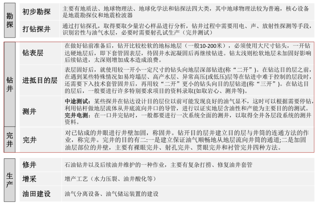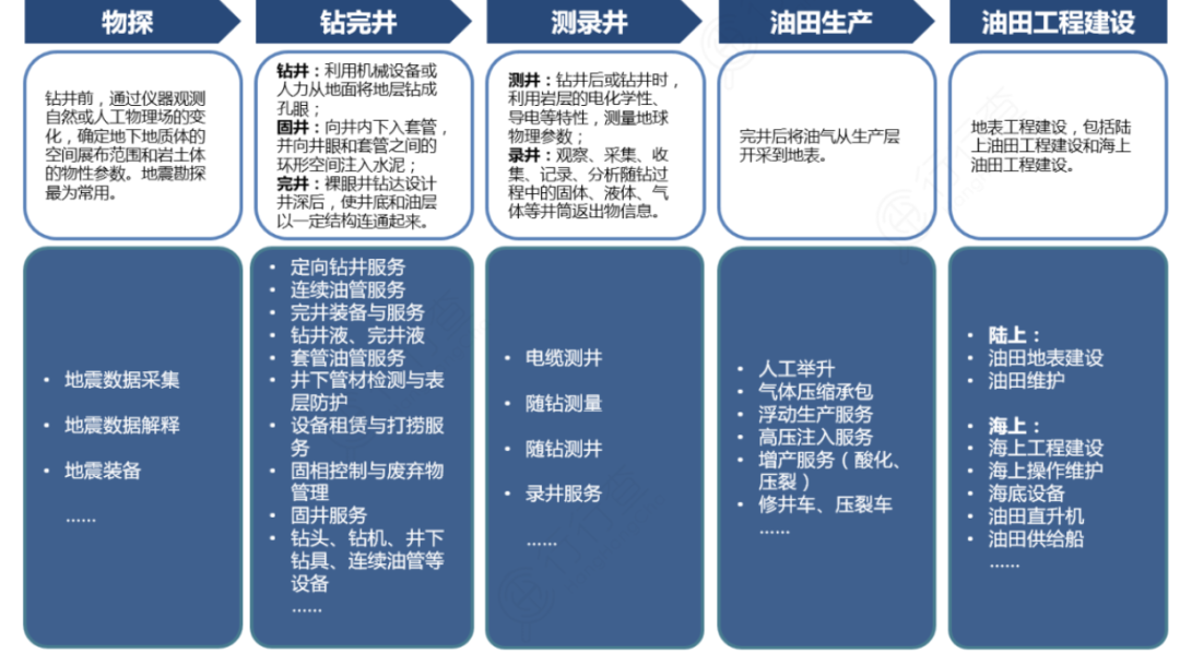 在陆地开发过程中,需要建立油气集输的地面设施,相关公司包括中油工程、惠博普、 海默科技。在海洋油气开发过程中,涉及海洋钻井和采油平台的搭建,对应公司包 括中油工程和惠博普。勘探类公司包括潜能恒信、恒泰艾普、中海油服、石化油服 等。