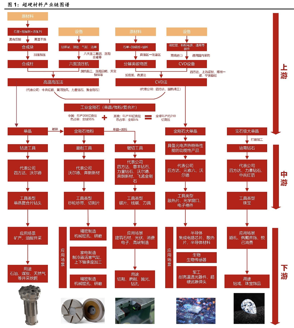 从产业链结构来看,超硬材料产业链主要由上游核心装备制造与超硬材料合成、中游超硬制品生产、下游应用领域构成。