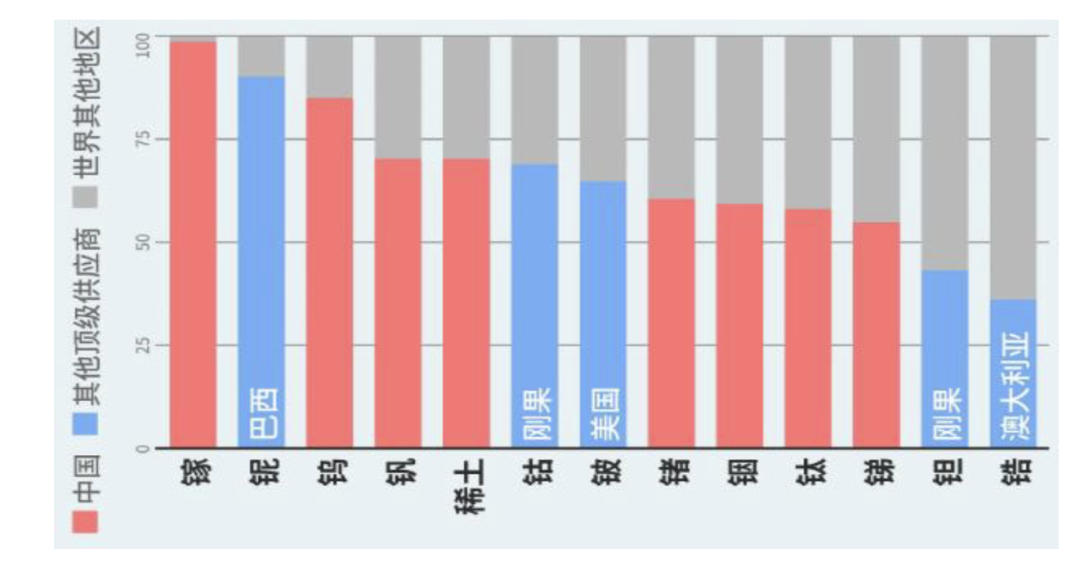 13 种战略“关键矿物”,中国占据了其中8种50%以上的产量: