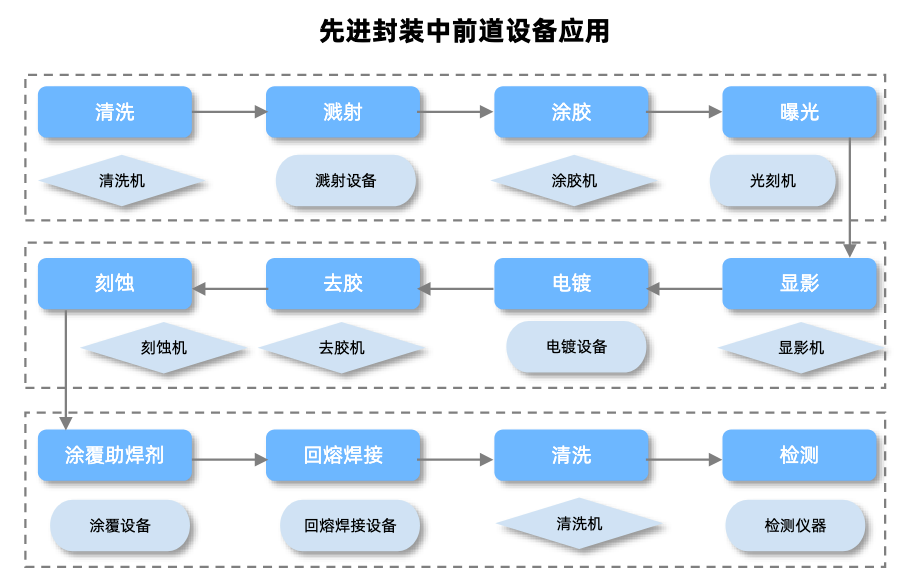而先进封装装备技术快速升级,以及前道工艺后移,进一步推动刻蚀/薄膜沉积/电镀等设备需求增量。