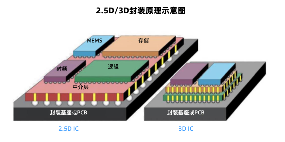 从2D到3D:随着制程节点逼近物理极限,3D封装成为突破性能瓶颈的核心手段。3D封装将多个芯片垂直堆叠,通过硅通孔(TSV)实现芯片之间的电气连接。这种封装方式能够进一步提高芯片的集成度和性能,但技术难度也相对较高,目前可用于DDR、HBM等存储芯片封装中。