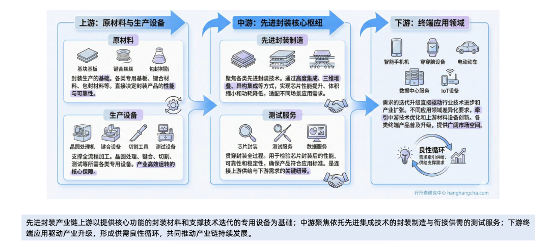 先进封装产业链包括上游原材料及设备、中游封装和测试以及下游应用。