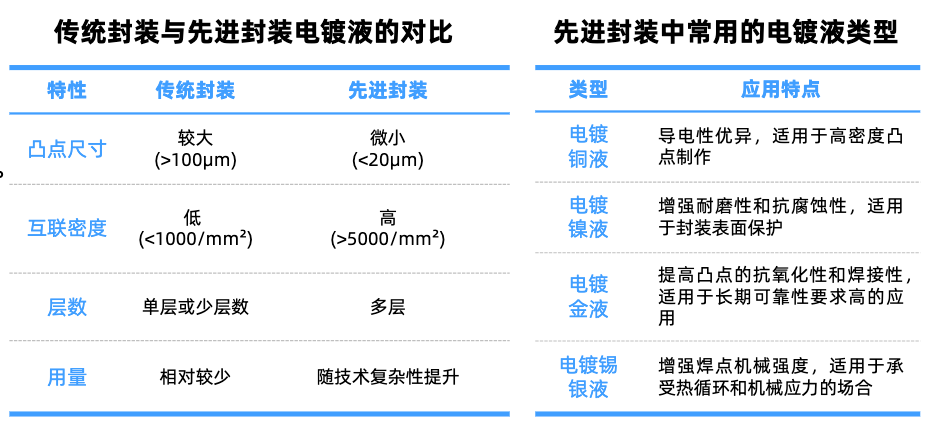 电镀液:电镀工艺在先进封装中广泛应用。电镀液是半导体制造的核心材料之一,由主盐、导电剂、络合剂及各类电镀添加剂组成,用于TSV、RDL、Bumping及混合键合等工艺中的金属化薄膜沉积。国内主要布局厂商包括强力新材,艾森股份,天承科技,上海新阳等。
