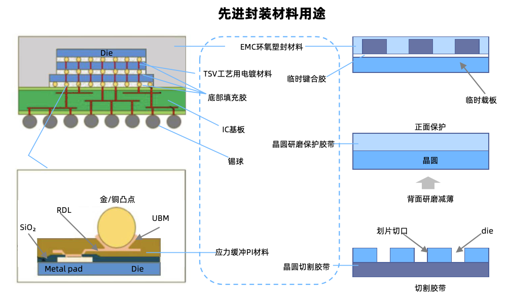 先进封装相对传统的变化主要在于对减薄/抛光要求提高和新增RDL、Bumping、TSV环节,主要材料包括电镀液、临时键合胶、PSPI等。