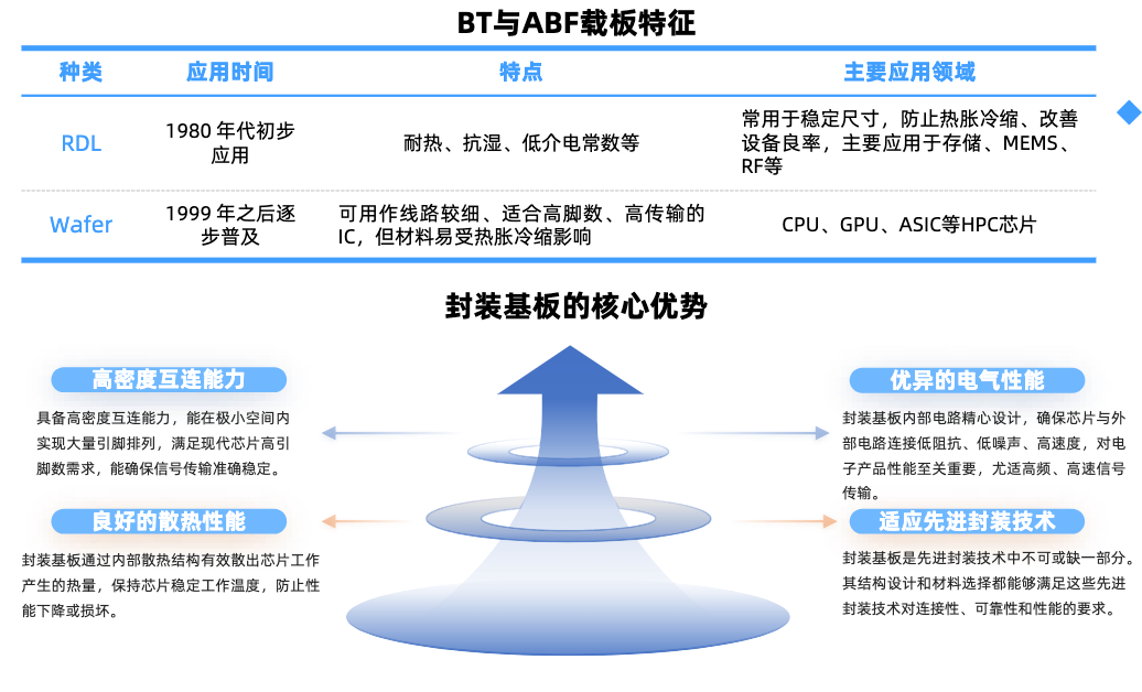 封装基板:在先进封装领域取代了传统的引线框架,为芯片提供支撑、散热和保护作用。相比其他PCB板,具有高密度、高精度、薄型化及小型化等特点。其中,ABF基板适合高密度布线和高传输速率的集成电路,用于高性能计算芯片封装,国内兴森科技、深南电路等厂商在该领域加速布局。