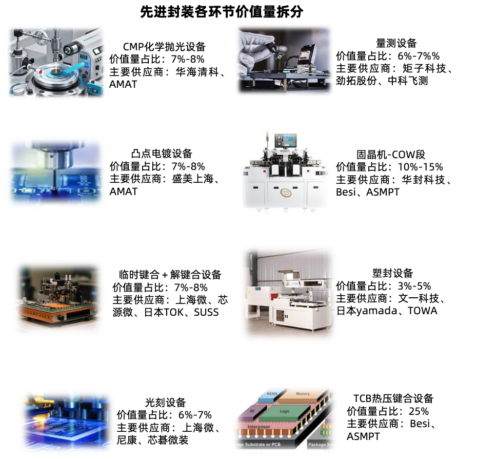 国内厂商中华海清科(CMP设备)、盛美上海(电镀)、芯源微(涂胶显影、临时键合与解键合)、中微公司(TSV深硅刻蚀)、拓荆科技(混合键合设备)、上海微电子(光K设备)、芯碁微装(直写光刻设备)是设备领域主要布局厂商。后道工艺布局厂商包括文一科技、耐科装备、新益昌(固晶机)、光力科技(减薄机)、德龙激光(SIP封装)、奥特维(半自动划片机)、长川科技、华峰测控、三超新材等。