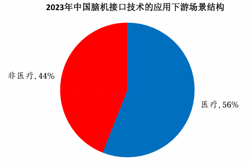 脑机接口下游应用场景以医疗方向为主。从下游应用结构来看,2023年中国脑机接口下游应用解决方案企业中医疗领域占比达到56%,其他消费类、工业类、教育类等非医疗领域企业占比44%。