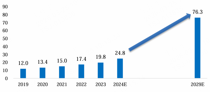 图:2019-2029年全球脑机接口产业规模及前景预测(单位:亿美元)