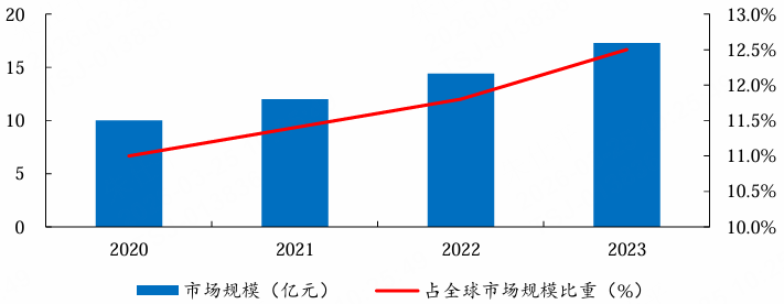 我国脑机接口产业处于全球领先水平。据量子位数据,2020年我国脑机接口市场规模约十亿元,2023年我国脑机接口行业市场规模增至约17.3亿元,我国脑机接口市场规模占全球脑机接口市场规模也增长至12.5%。