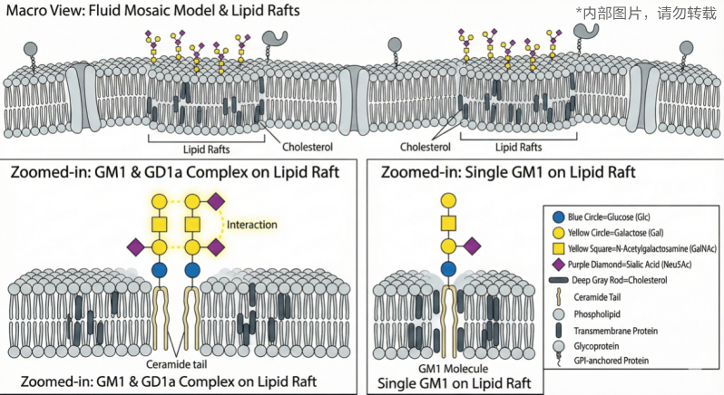 神经节苷脂常聚集于细胞膜的糖鞘脂富集微域,患者体内不仅存在单体抗体,还可能产生两种神经节苷脂形成的复合体抗体,而单体检测可能无法识别复合体抗原表位。漏检一个复合体抗体,可能错过一个诊断。