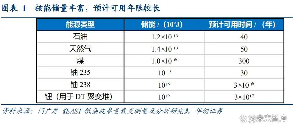 《人民日报》2025 年 6 月 10 日第 01 版刊载《对话任正非:国家越开放,会促使我们更加 进步》,任正非回答记者关于人工智能的未来怎么看时,答道“人工智能也许是人类社会 最后一次技术革命,当然可能还有能源的核聚变。” 核聚变的核心竞争力体现在近乎无限的燃料储备及超长周期可持续性。 根据闫广厚论文《EAST 低杂波参量衰变测量及分析研究》:核聚变的燃料来源更为丰富, 如氘可以从海水中提取,预计可用时间极久,有望最终解决人类能源问题,如锂作为氘 氚聚变堆(DT 聚变)的核心燃料之一,其储量极为丰富,预计可用时间长达 3×10¹⁷年, 这一水平在绝对规模上超越所有传统能源——石油(40 年)、天然气(储能 50 年)、煤 (300 年)以及铀 235 裂变燃料(30 年)。 可控核聚变或将成为解决人类能源问题的终极方案。 自进入工业社会以来,人类对原材料同能源的需求日益高涨,但迄今为止绝大多数原材 料及能源均来自不可再生的地底矿物储存,考虑到传统化石能源的日渐枯竭以及可再生 能源目前存在的不稳定性问题,核能无论从环保性还是经济性上来说,都是一种不可或 缺的代替能源,而可控核聚变在技术突破后有望终结全球能源短缺困境,并重构全球能 源体系。