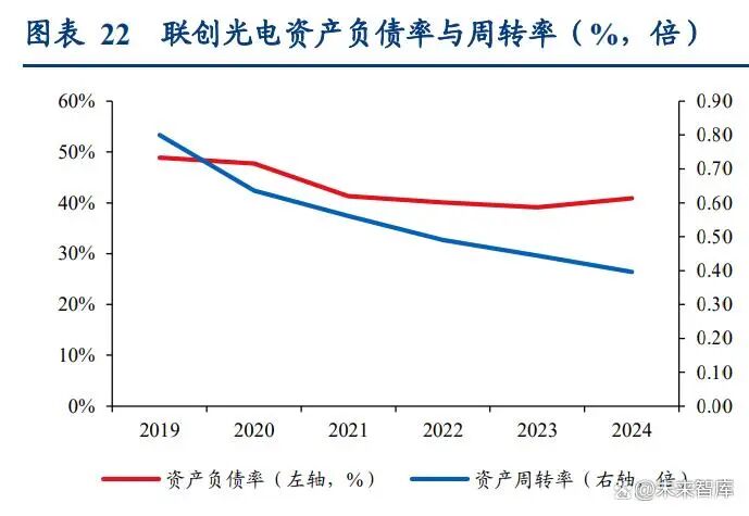 24 年净利率有所承压,资产周转率持续下滑。 2024 年,公司实现毛利率 18.2%,同比基本持平,净利率实现 9.3%,同比下降 3.1pts, 主要系公司针对背光源板块做减法,并对手机背光源存货资产计提了较大额度的减值, 使得净利率承压下滑。 2024 年,公司资产负债率为 40.9%,同比上升 1.7pts,资产周转率 0.40,同比下降 10.8%。
