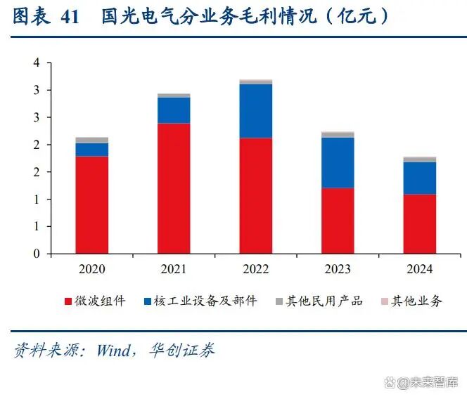 分业务来看: 营业收入方面,公司营收主要由微波组件、核工业设备及部件、其他民用产品三部分构 成。2024 年,微波组件业务实现收入 2.77 亿元,同比下滑约 5.3%,主要系军工电子行业 整体需求放缓,客户订单出现延迟或减少所致;核工业设备及部件业务收入为 2.03 亿元, 同比下滑约 45.4%,成为营收下滑的主要拖累项,核心缘由是国际热核聚变实验堆(ITER) 项目技术标准发生变更,致使多个合同签订进程延迟;其他民用产品业务收入 0.54 亿元, 同比下降约 22.17%。 盈利能力方面,微波组件业务毛利率自 2021 年起呈逐年下行态势,2024 年约为 39.3%, 同比下降 1.9pts;核工业设备及部件业务毛利率 2024 年同比提升 4.3pts,达到 29.2%;其 他民用产品业务毛利率 2024 年实现 15.7%,同比提升 2.9pts。2024 年,微波组件、核工 业设备及部件业务毛利占比分别为 61%、33%,合计贡献了公司总毛利的 94%。