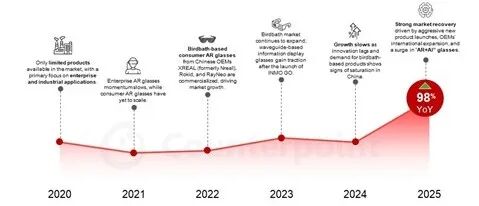 2025全年全球AR智能眼镜市场出货量同比增长98%,创下该市场历史新高。