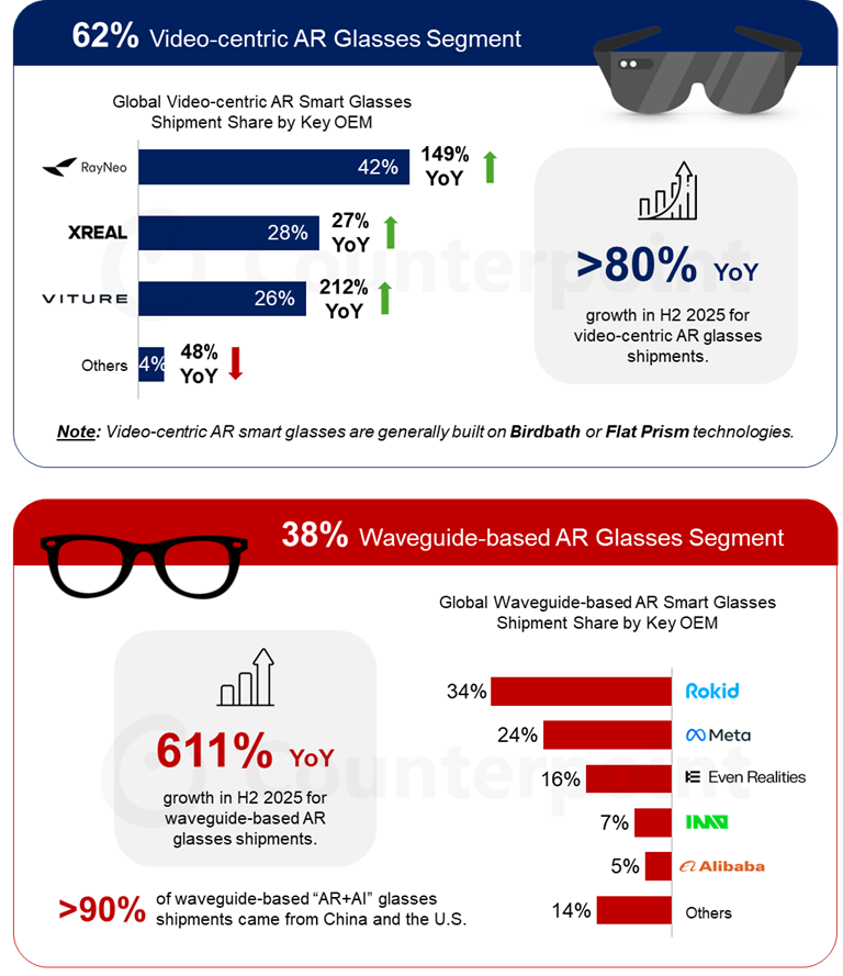 2025 下半年,在多项驱动因素的带动下,市场实现了148% 的高同比增长。这些驱动因素包括: Rokid眼镜出货量大幅提升、Meta Ray-Ban Display的发布,以及雷鸟、VITURE、Even Realities、影目及阿里巴巴等厂商推出的一系列新产品。在这一利好的市场态势下,两大核心品类均实现扩张 ——观影类 AR 智能眼镜(通常采用Birdbath或Flat Prism透镜方案)同比增长 80%;而基于光波导技术的信息显示类 AR 眼镜出货量则同比涨超 600%。因此,波导类产品在整体市场中的份额升至38%,远高于 2024 年下半年的 13% 及 2025 年上半年的 19%。
