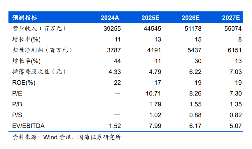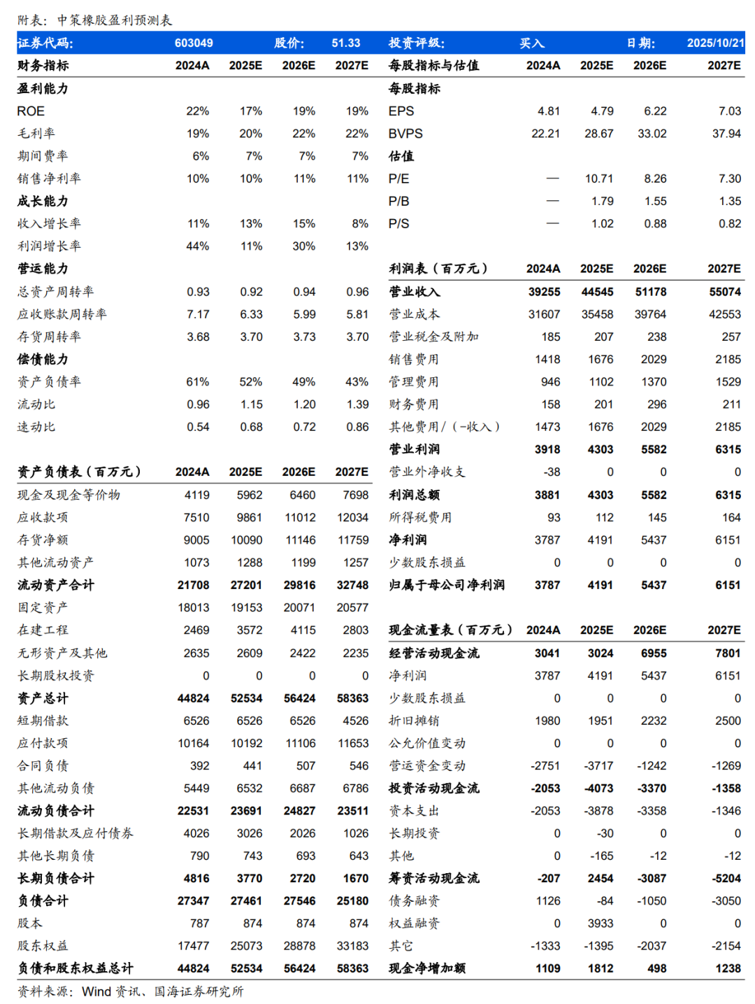 目前,全球轮胎行业面临复杂的贸易摩擦形势。美国及欧洲是两大轮胎主要消费市场,但轮胎产能相对集中在东亚、东南亚,欧美市场对进口轮胎依赖度较高。2025年,美国宣布对各国加征额外关税,欧盟也宣布启动对中国轮胎的反倾销调查。此外,墨西哥、南非等国也于近年出台轮胎相关的贸易限制措施,轮胎行业未来仍将不断受到新增贸易政策的挑战。在贸易摩擦风险加剧的背景下,头部轮胎企业正快速进行国际化布局。凭借分布在不同国家的生产基地和丰富的海外基地运营经验,轮胎企业可以进行更灵活的订单分配,从而保持对主要轮胎市场的性价比优势,将风险转化为机遇。公司自成立以来致力于为国内外消费者提供高质量、高性能、绿色节能的多样化轮胎产品,是国内外销售规模最大的轮胎制造企业之一。公司产品广泛应用于乘用车、货车、客车、工程机械、特种车辆、电动车、摩托车、自行车等场景,是我国产品类别最齐全、下游覆盖领域最为全面的轮胎制造企业。据中国橡胶杂志公众号(2025/09),在2025年度全球轮胎75强排行榜中,中策橡胶位列全球第九,在所有中国轮胎企业中位列第一。我们认为,未来公司有望凭借全球多基地布局、多品类覆盖,带动业绩稳步增长。预计公司2025-2027年营业收入分别为445.45、511.78、550.74亿元,归母净利润分别为41.91、54.37、61.51亿元,对应PE分别为10.71、8.26、7.30倍。公司是国内产销最大的轮胎制造企业,旗下轮胎品牌“朝阳”是我国知名度较高的轮胎品牌之一,近年来公司收入规模持续增长,我们看好公司成长性,维持“买入”评级。