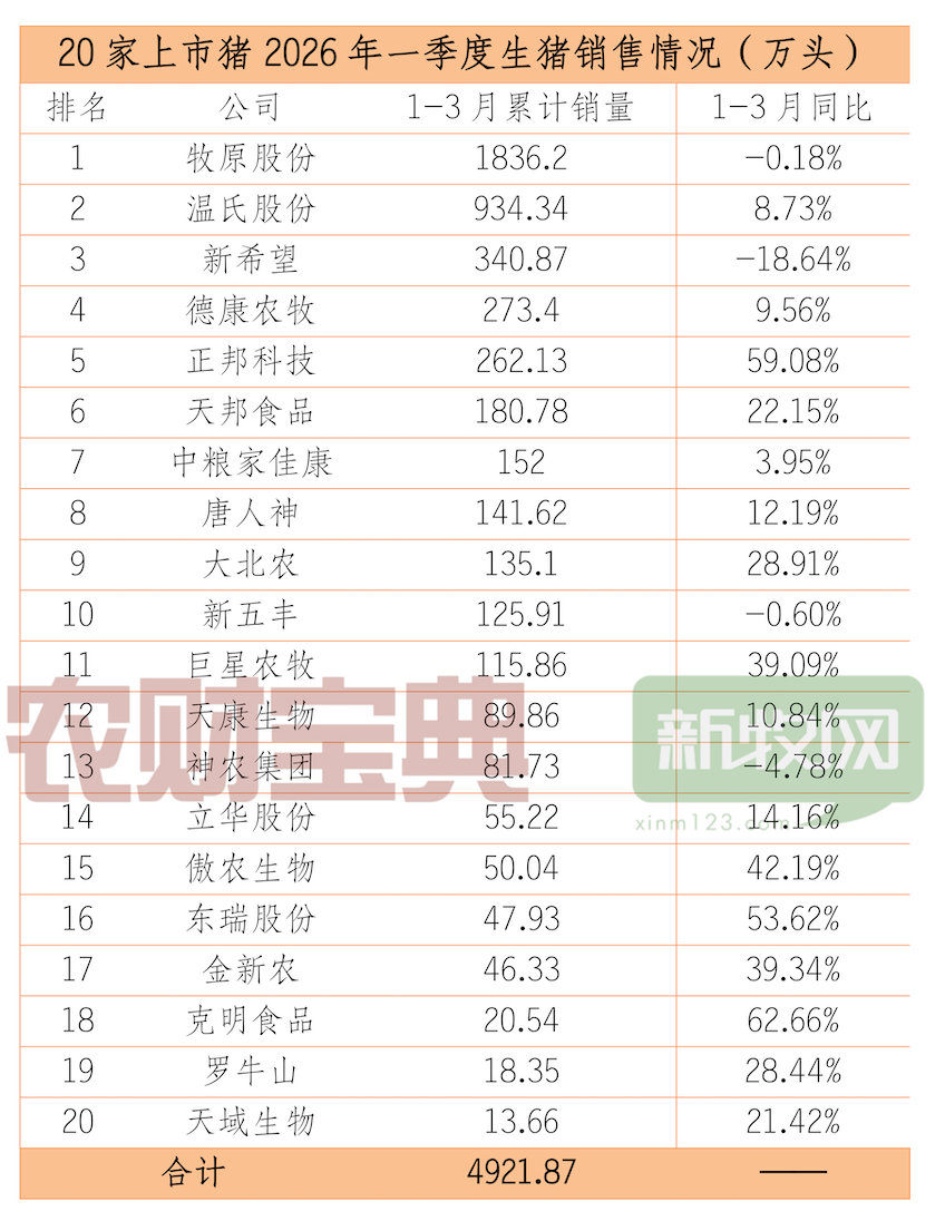从一季度累计出栏数据看,20家上市猪企合计出栏生猪4921.87万头,其中16家企业出栏量同比实现正增长,占比达80%,仅4家企业同比下滑。