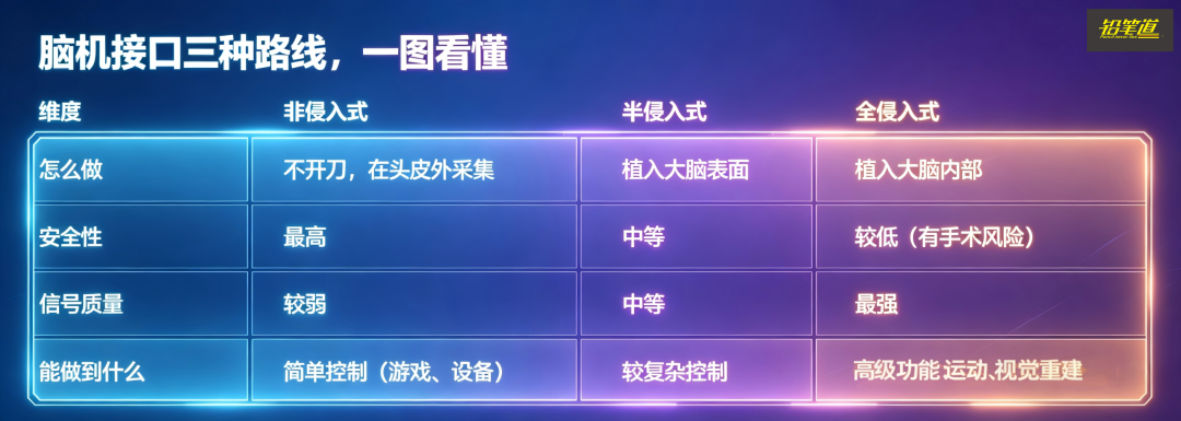 非侵入最容易商业化,已经可以卖产品了。半侵入在医疗场景里找平衡。全侵入最难,但上限最高——比如视觉重建这样复杂的能力,必须走全侵入。