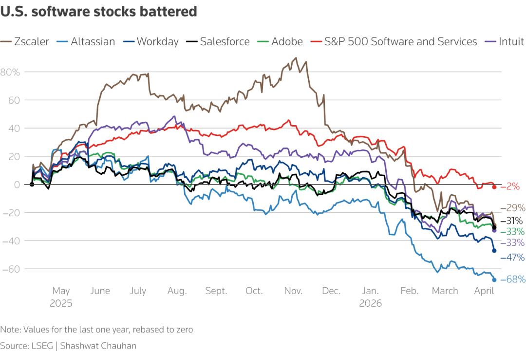 短短一年间,标普500软件和服务指数已经缩水了25.5%,这是行业底层逻辑在崩塌。