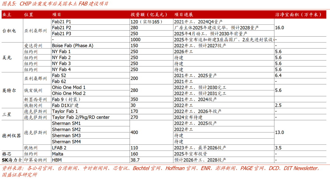 半导体CAPEX扩张带动洁净室需求增长,继续看好优质台资出海及大陆需求改善两大主线。AI发展驱动全球算力需求快速增长,台积电、美光等龙头2026年资本开支指引在高基数上进一步抬升,持续验证半导体资本开支步入扩张周期,洁净室作为前端基建环节(占总投资约15%),需求有望同步放量,区域上看:1)美国:CHIPS法案签署以来本土晶圆厂规划及在建总投资已达4854亿美元(其中台积电、美光合计超2000亿美元),系2010前后-2020年间十倍以上,资本开支大幅扩张。台资龙头凭借与台积电、美光等核心客户的深度合作积累,在技术标准、工艺理解及项目响应速度上具备显著优势。当前汉唐集成已依托台积电亚利桑那项目切入美国市场,后续随着区域项目逐步推进,其他台资赴美进程预计将显著提速,持续重点推荐具备美国业务承接潜力的优质台资龙头亚翔集成(母公司一季度收入同比高增67%)、圣晖集成;关注美埃科技(洁净室过滤设备龙头,已设立美国子公司)。2)大陆:受国产替代驱动,先进制程扩产需求旺盛,龙头资本开支维持高位,叠加AI需求增长带动存储景气上行,两存加速扩产,区域洁净室需求预计较25年显著改善(25年受关税等因素影响大陆半导体企业外销及原料设备进口受阻,资本开支有所放缓,项目执行延后),龙头业绩有望明显修复,重点推荐柏诚股份;关注深桑达A。