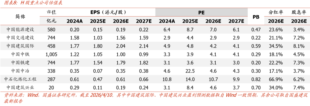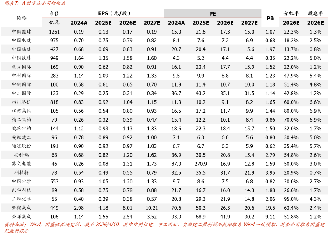美以对伊战争停火谈判启动但变数犹存,能源自主可控仍是长期重点投资方向,继续核心推荐:1)煤化工:重点推荐拥有实业的煤化工EPC龙头中国化学(26PE 7.5X)、东华科技(26PE 16X);2)新型电力系统及绿色能源 :重点推荐和关注电力能源综合服务龙头中国能建(H股26PE 7X,PB 0.47X)与中国电建(26PE 7.2X,PB 0.68X);核电建设龙头中国核建(26PE 17X),企业微电网龙头安科瑞,稀缺配网一站式服务商苏文电能(26PE 17X)。若后续停战落地,则国际工程公司有望受益于中东战后重建,重点推荐国际工程龙头北方国际(有望同时受益“煤价/电价/战后重建”三重逻辑共振,26PE 18X)、中材国际(26PE 8.8X,26E股息率5.4%)、中钢国际(26PE 11X)、中工国际(26PE 35X),以及能源化工工程龙头中石化炼化工程(26PE 11X,26E股息率6.2%)、钢结构出海龙头精工钢构(26PE 10X,26E股息率6.9%),全球高端幕墙龙头江河集团(26PE 12X,26E股息率6.9%)。洁净室方向看好优质台资出海龙头亚翔集成、圣晖集成及受益大陆需求改善的柏诚股份。此外还推荐优质成长股龙头鸿路钢构(26PE 18X)、利柏特(26PE 32X)、东南网架。