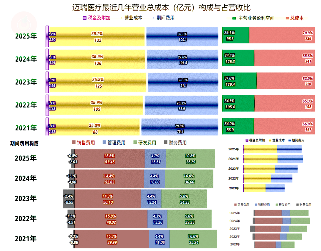 除了毛利率下滑的影响之外,期间费用占营收比上升也有较大的影响。这当然和营收下跌有关,哪怕迈瑞医疗紧急通过抑制期间费用的增长,2025年甚至还同比略有下跌,但暂时起不到较大的作用。