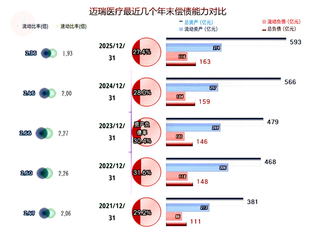 迈瑞医疗的资产负债率极低,长期偿债能力极强;速动比率和流动比率很高,短期偿债能力也极强。