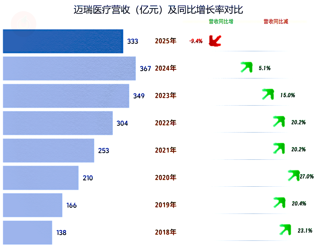 2025年,迈瑞医疗的营收同比下跌近一成,这是其多年不见的下跌。在400亿规模之前,迈瑞医疗遇到了增长阻力,对于任何一家公司来说,都会有这样的阶段性极限问题, 迈瑞医疗在如此大的规模才遇到这种情况,当然是比较厉害的了。