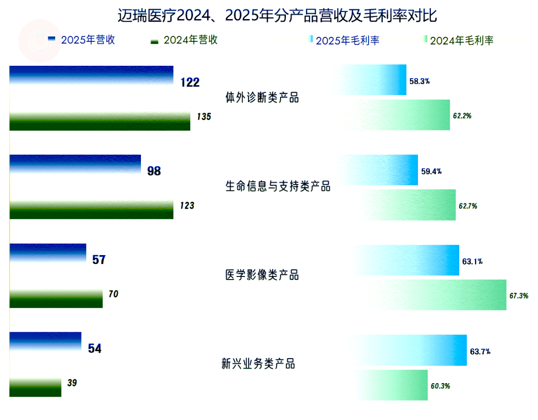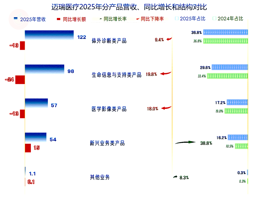 前三大业务都在下跌,“体外诊断类产品”下跌近一成,算相对好的;“生命信息与支持类产品”和“医学影像类产品”都是近两成的下跌。“新兴业务类产品”的近四成增长,抵消掉了前三大业务的部分影响,但已经无法通过其延续增长了。