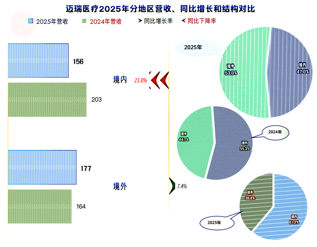 境内市场下跌超两成,境外市场还有7.4%的增长。境外市场在两年前占比还不到四成,2025年就达到53%,成为第一大市场。这当然是国际化程度提高的良好趋势,但国际市场也有风险更高,特别是在现在的贸易环境下,甚至是战争频发的年代,更是如此。没有办法,不是要挑这个时间点来国际化,而是发展到这个阶段,迈瑞医疗和类似的企业,才具备这样的实力。