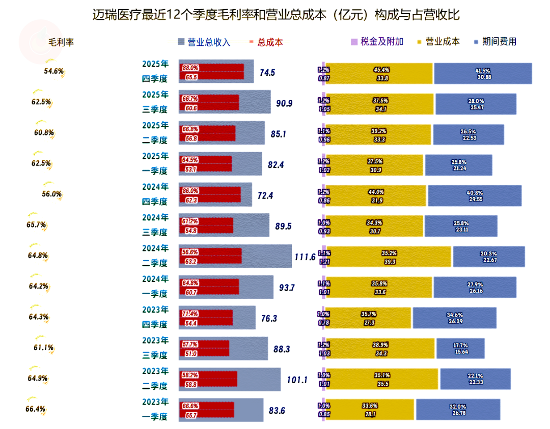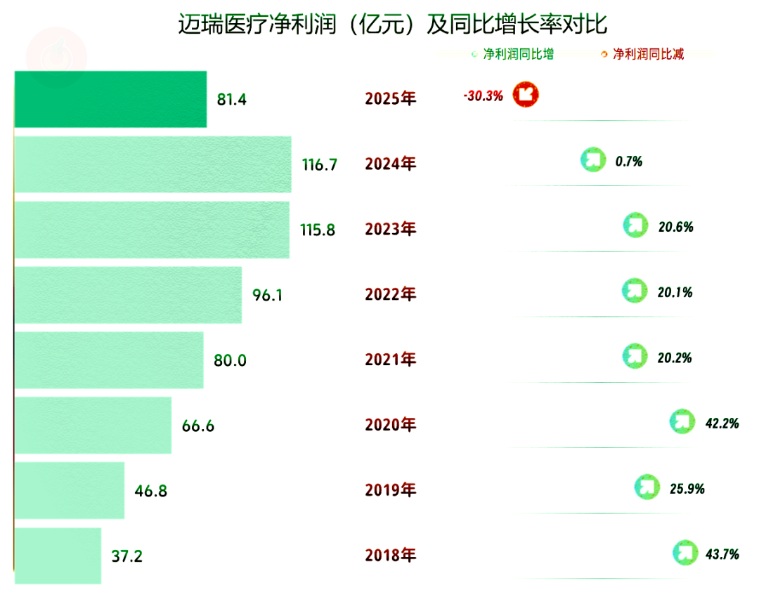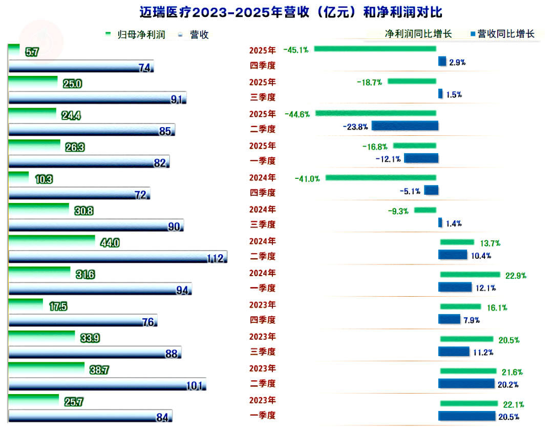 分季度来看,迈瑞医疗从2024年三季度开始,营收同比增长基本停滞,净利润出现同比下跌。2024年四季度就出现了营收和净利润双下跌,到2025年三季度和四季度,营收的同比下跌转为同比微增,但净利润的同比下跌并没有得到改善。