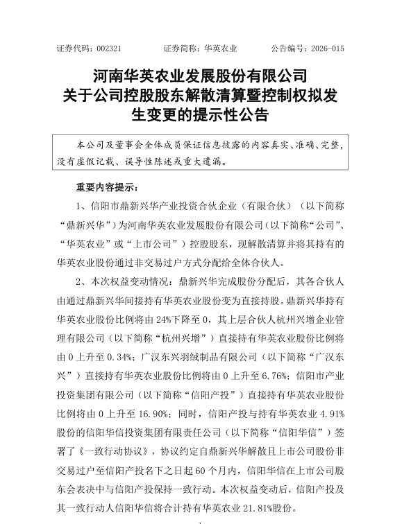 根据4月9日《鼎新兴华合伙人会议决议》,鼎新兴华全体合伙人一致同意鼎新兴华解散,届时其所持华英农业股份将原则上按各合伙人出资额比例进行分配。