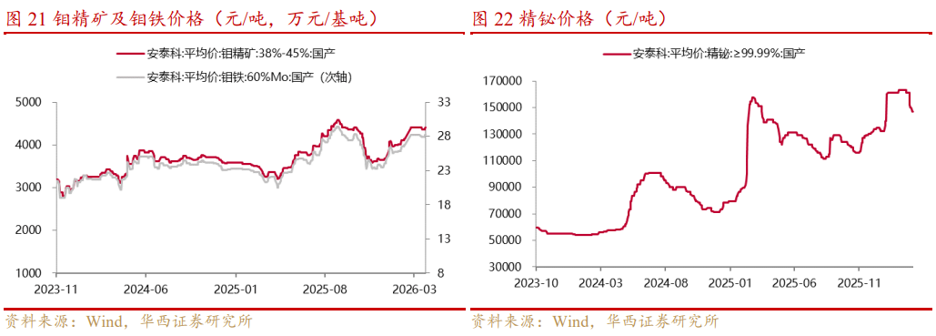 需求端由传统特钢、新能源、军工高端制造三轮驱动,常规需求稳健增长,光伏 HJT 钼靶材、风电高端特钢等新兴赛道需求快速放量,而军工领域因钼具备超高熔点、高强度、耐高温腐蚀特性,是装甲钢、火炮身管、导弹壳体、航空发动机高温合金不可或缺的核心原料,属于典型 “战争金属”,在地缘冲突升级背景下需求弹性显著放大。