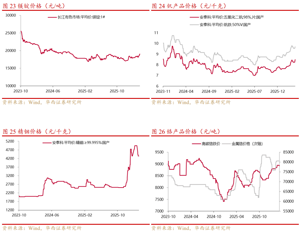 镁锭价格较上周下跌0.89%至18,890元/吨。需求端,下游补库后库存充裕,采购转为按需谨慎模式。镁价站稳17500元/吨后,下游观望压价,成交以刚需小单为主,需求支撑减弱。出口表现平淡,海外需求疲软,对国内拉动有限。供应端,冶炼生产平稳,叠加检修预期,挺价心态增强。工厂库存处历史同期低位,现货流通偏紧;大厂控量挺价、现货投放少,仅少数中小厂零星低价出货,整体供应偏强。成本端支撑强劲,兰炭、电力等原辅材料价格高位,吨镁成本居高不下,行业利润微薄,企业让利意愿低,价格下行空间受限。