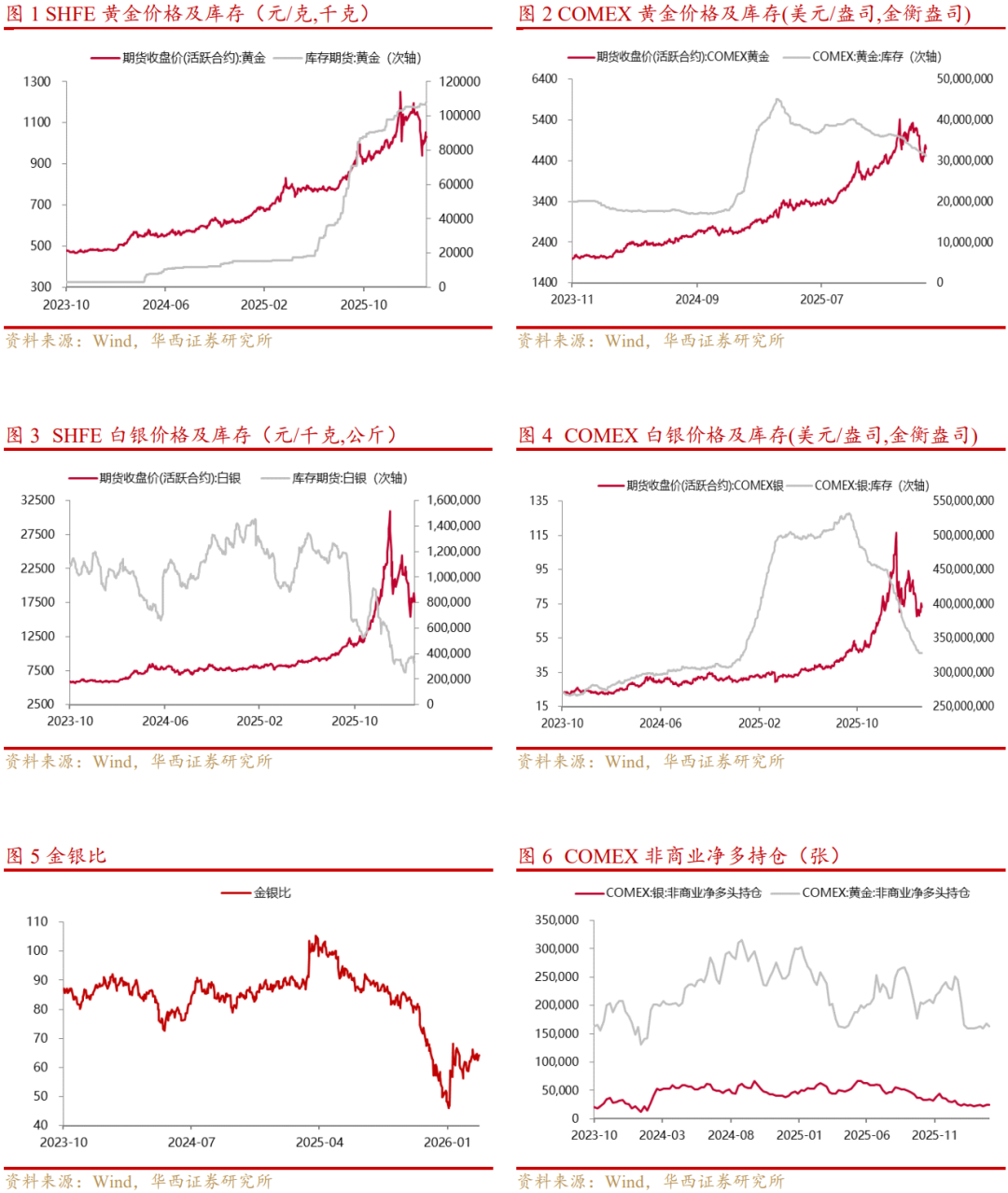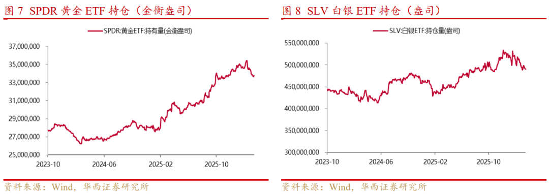 本周金银比下跌2.28%至62.76。本周SPDR黄金ETF持仓减少64,299.34金衡盎司,SLV白银ETF持仓增加860,135.20盎司。